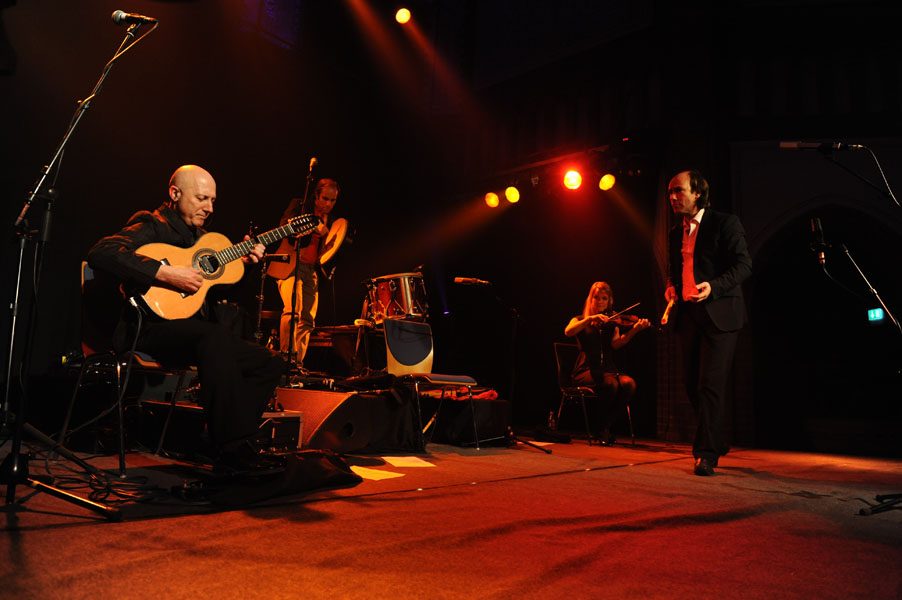 Hier in Köln nutzte er dagegen die kuriose Kulisse. Von der Kanzel spielte ein Australier, an der Geige im Altarbereich eine Dublinerin, am Schlagzeug Carlos Bruder und an der Gitarre ein waschechter Galego mit Glatze. Sogar die Orgel hat der Mann aus Nordwestspanien einbezogen und eine fast dreistündige Show hingelegt, die musikalisch viel bot. Keltischen Sound, angereichert mit Tönen aus Kuba, Mexiko und Skandinavien.