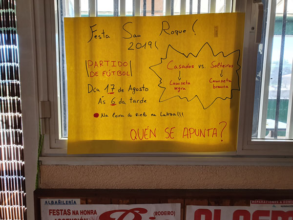 Die Frage ist nur: Wie einfach ist da die Teilnahme? Also habe ich mich zum Spiel angemeldet. In Rodeiro, einem kleinen Ort wenige km östlich von Lalín in Galicien mit seiner Hauptstadt Santiago de Compostela. War da gerade unterwegs und hab von dem Event in der Dorkneipe erfahren. Durch das Schild, siehe Foto unten.