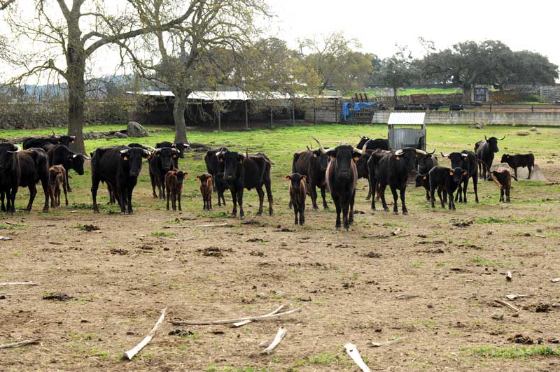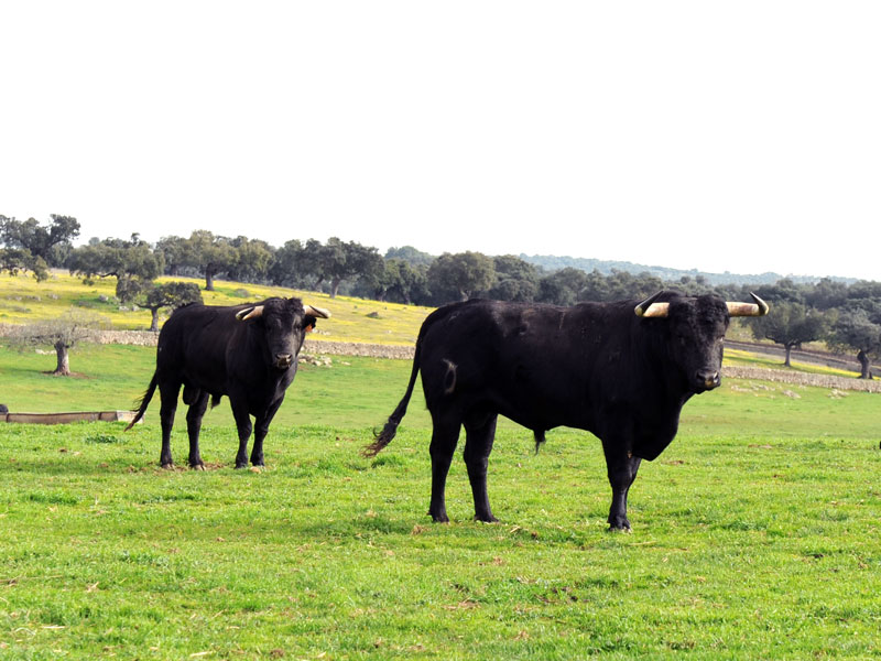 Er wiegt 700 Kilo. Er ist über 10 Jahre alt. Farruquito ist ein optisches Ereignis und der Star der Stierzucht von Luis Terrón in der Extremadura. Dabei ist der Toro aus der Finca Los Fresnos für die Arena wirklich nicht geeignet. Meine Frau hat das getestet und dem Stier sogar an die Hörner gefasst.